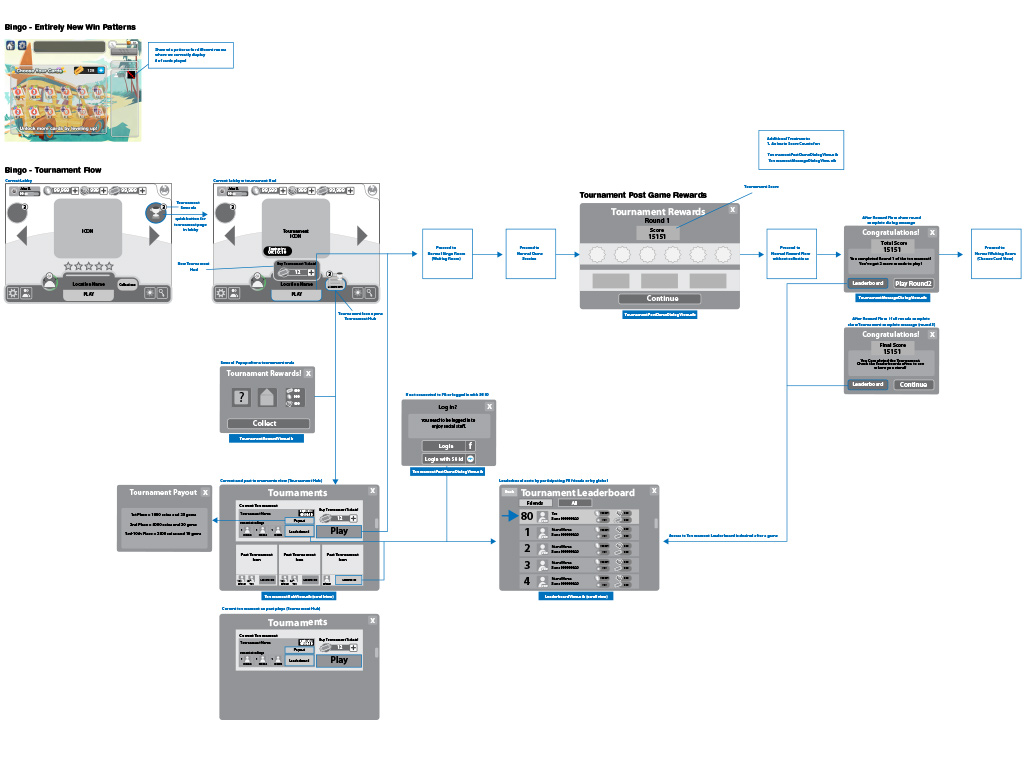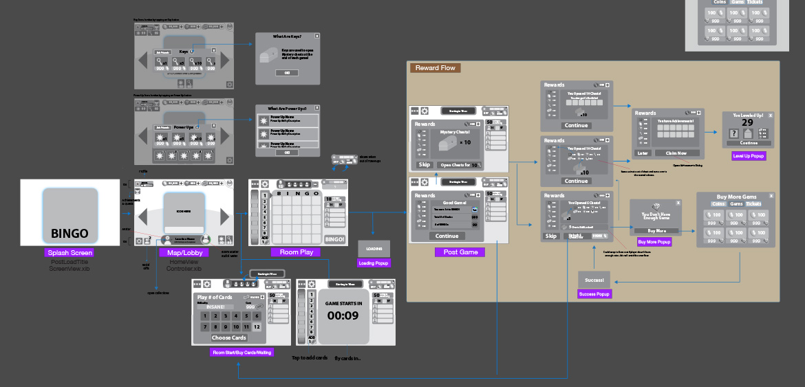 Bingo! surpassed its biggest competitor Bingo Bash at one point on the top grossing charts on IOS. I had a tremendous opportunity to innovate on the way users play bingo on mobile devices. Through research and my own user study, I was able to identify the biggest pain point across all of the top mobile bingo games. The main issue for playing on a phone device was the inability to play more than 2 or 3 cards due to the time it takes to change the card view and the amount of re-orientation the user's eye needs to make to read the switched card. To address the issue I created a mobile app prototype that enabled users to flip through cards and play up to a whopping 8 cards at a time! The prototype was actually playable and got the majority of key stakeholders advocacy. The new switch card mechanic made it into the game and became insanely successful. I provided complete UI/UX design and wireframes, animations and visual feedback, UX flows for new features and tournament play. The Bingo! platform worked so well, they made Monopoly Bingo! on the the same platform.