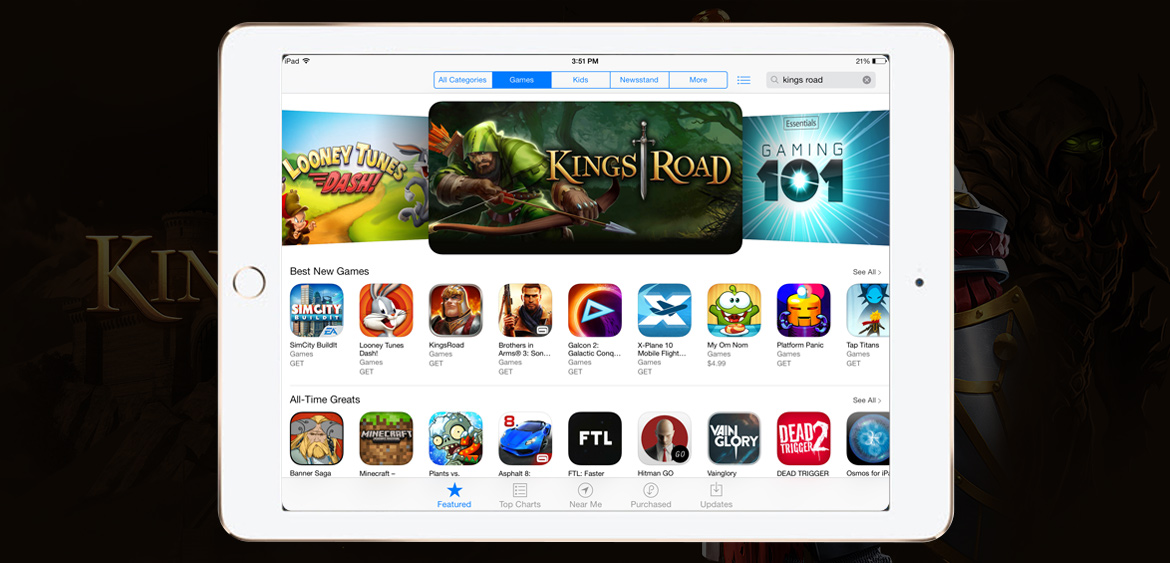 Kings Road is an RPG that has been going strong for years now and when I jumped on this product the team was attempting to do something extremely difficult. Port the Flash-based game from web to mobile phone and tablet. Due to the success of Kings Road on web, this was of course the most obvious growth strategy for the product. With a game as robust in features as any good RPG out there, most of the designers out there who work in games probably have an idea of how much work this was. Because we were targeting multiple platforms like Android/IOS/Steam and other web portals at the same time! :) What was most challenging about this endeavor was not conforming to the multitudes of form factors out there when talking about cross-platform mobile phones and tablets, it was about preserving the rich experience that players have been experiencing on web...essentially all of the flash-enabled bells and whistles which perfomed extremely well on web and desktop. What this entailed was an asset optimization effort that's analogous to arming Michaelangelo with crayons to paint the ceilings of the Sistine Chapel. Effects and animations had to be re-rendered in ways we couldn't have imagined so that we could reach the minimum spec device profile we were aiming for.