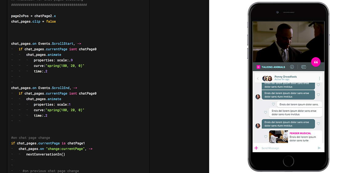 Watchat, is a short-form video streaming / chat app. It's value proposition is simple: Watch & Chat...at the same time! What sounds simple enough presented a huge design challenge since our main differentiating feature of having a decoupled conversation while watching content was extremely tricky to pull off. Imagine having a watch party for the season premier of The Walking Dead over at your house. All of your friends pile up on your couch in front of the tv and the show begins. The conversations taking place during the show, in between commercial breaks and after the show would range from on-topic and off topic subjects. Some of the conversations would be inspired by movie trailers, ads, and other commercials or shows being advertised on the channel currently being watched. This experience is what Watchat delivers on with additional features that intend to provide content to encourage engaging conversations such as video clip sharing and the sharing of video emotes to any conversation. For Watchat, I developed MANY on device prototypes using Framer.js. Special attention to micro interactions and subtle contextual animations were used to help prompt users to take specific actions that encouraged the user behavior we hoped would become compulsive for the user. The ability to rapidly prototype features in Framer was invaluable since many UX decisions were informed through our testing of these prototypes on users internally and folks we intercepted off the streets and at colleges.