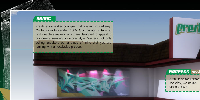 Flash & 3D website for So Fresh Kicks sneaker store located in Berkeley, California. The interior and exterior of the physical store was 3d modeled and animated, then brought to life and made interactive with Flash Actionscript. The site was truly an homage for sneaker pimps everywhere, it was one of my favorite web projects.