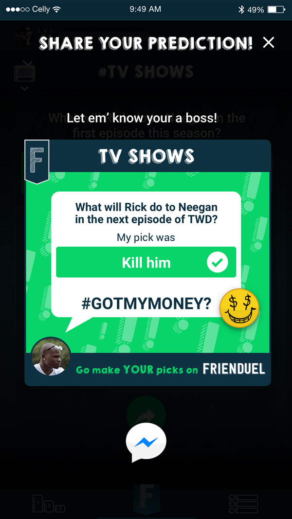 What do you get when you want to cross your typical social trivia game with Miss Cleo's tarot card hotline? You get FRIENDUEL, where you can battle friends for the future! With FRIENDUEL, we set out to create the next addicitive super casual game to play amongst friends. Pick up FRIENDUEL to make that last minute prediction on how many points Steph Curry will put up tongiht, or maybe place your bet on who comes out on top after the 2nd Presidential Debate! See if you can dominate the leaderboards and prove to your friends that you're the reincarnation of Nastradamus.