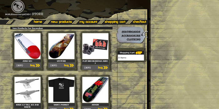 A phenomenal skateboard site and e-commerce shop for KazboardCo built in flash. Check out the 3D animated movies, slick flash animation and programming as well as the flash-enabled storefront. Needless to say, KazboardCo experienced massive increases in site traffic and revenue.