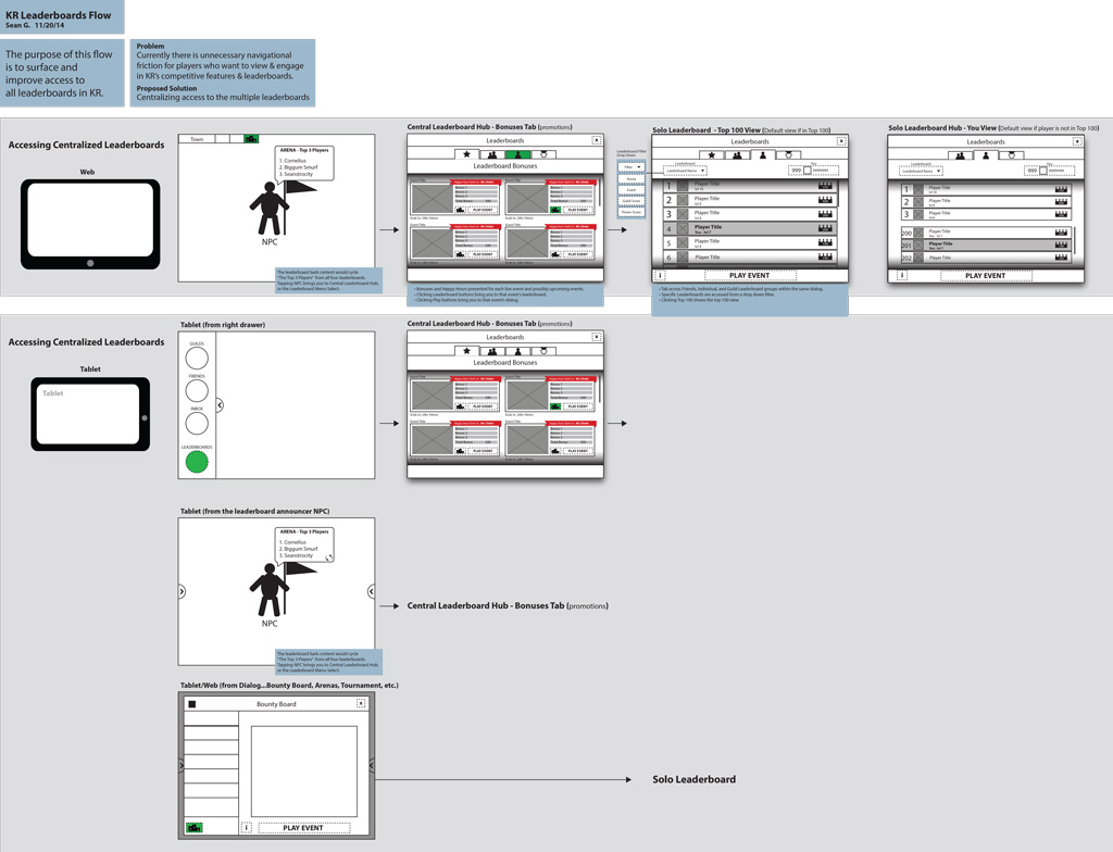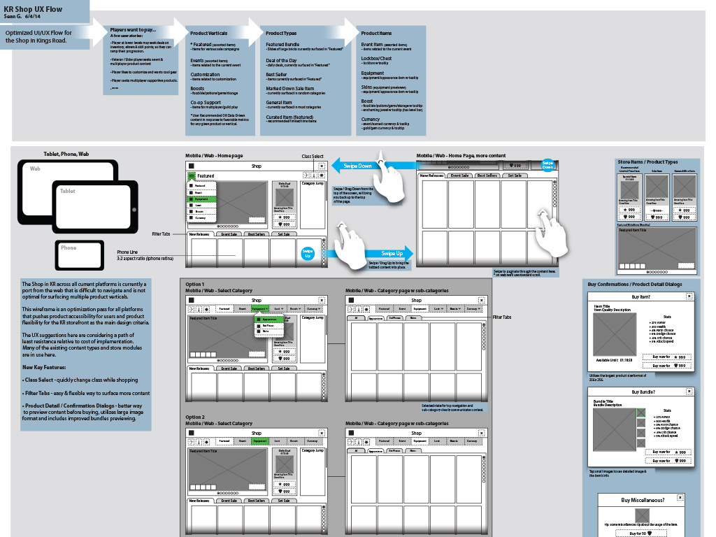 Kings Road is an RPG that has been going strong for years now and when I jumped on this product the team was attempting to do something extremely difficult. Port the Flash-based game from web to mobile phone and tablet. Due to the success of Kings Road on web, this was of course the most obvious growth strategy for the product. With a game as robust in features as any good RPG out there, most of the designers out there who work in games probably have an idea of how much work this was. Because we were targeting multiple platforms like Android/IOS/Steam and other web portals at the same time! :) What was most challenging about this endeavor was not conforming to the multitudes of form factors out there when talking about cross-platform mobile phones and tablets, it was about preserving the rich experience that players have been experiencing on web...essentially all of the flash-enabled bells and whistles which perfomed extremely well on web and desktop. What this entailed was an asset optimization effort that's analogous to arming Michaelangelo with crayons to paint the ceilings of the Sistine Chapel. Effects and animations had to be re-rendered in ways we couldn't have imagined so that we could reach the minimum spec device profile we were aiming for.