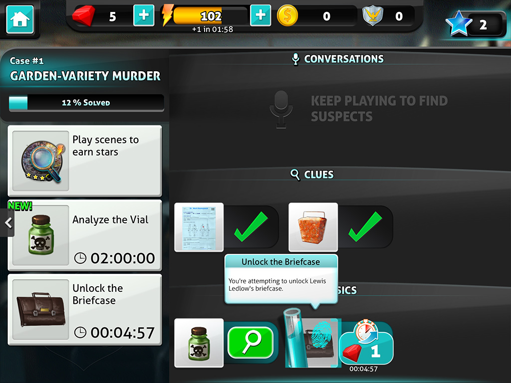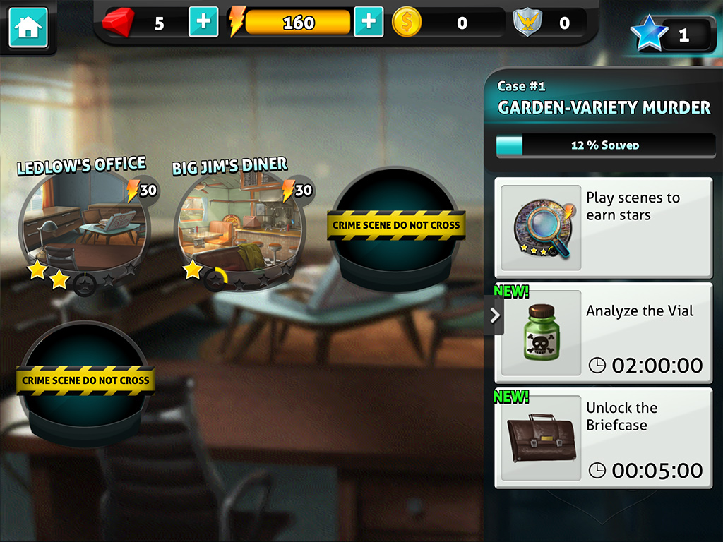 Hidden Objects: Mystery Crimes quickly became a top free and top grossing app on its IOS release. I created prototypes for much of the game's core loop which defined the interaction models, visual feedback animation and effects, scalable UI, which greatly supported system designs and feature expansion. I also helped established the visua style in the UI and contributed many UI/UX components used in the game.